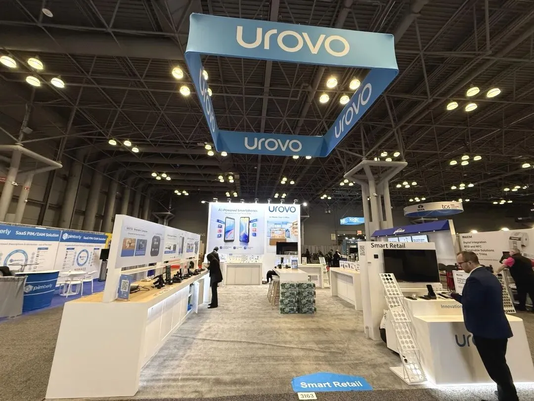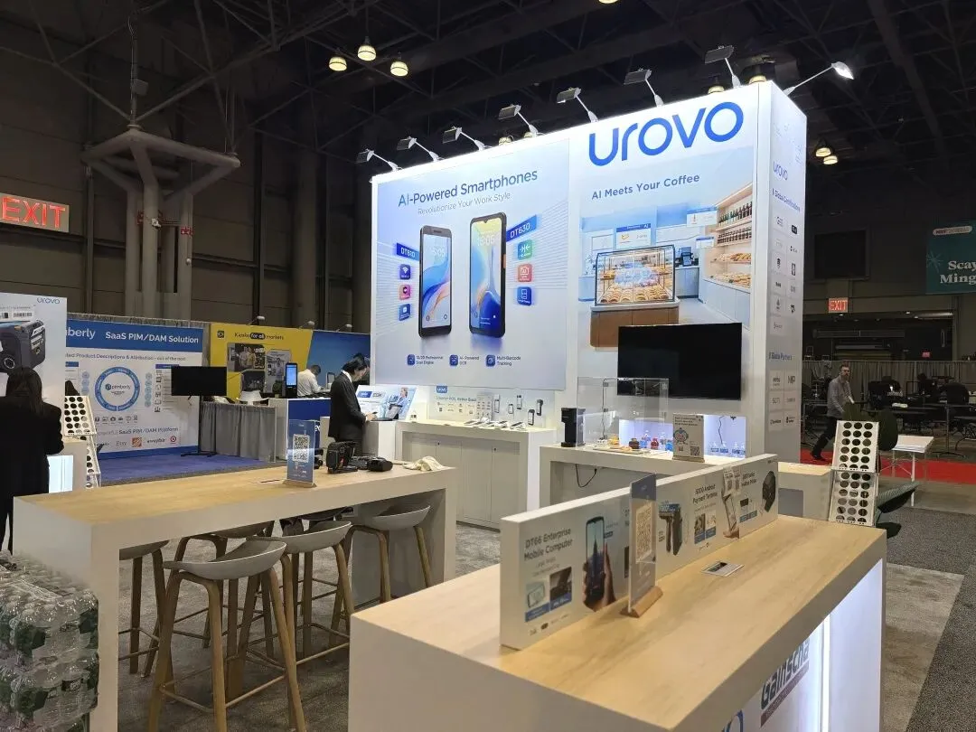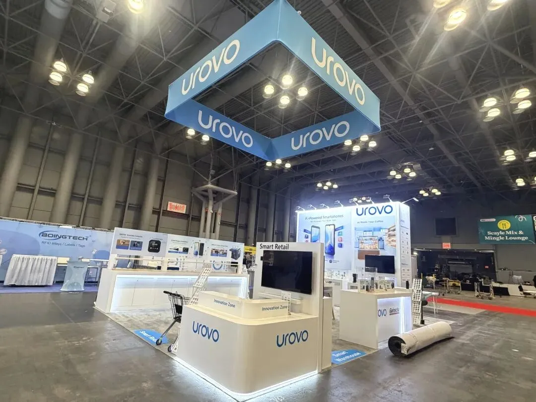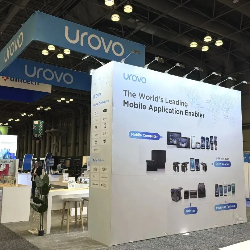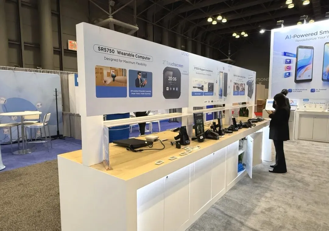 逸岚国际为 UROVO 打造的展台,以 “轻量化设计 + 场景化展示” 突出科技硬件品牌的特性: