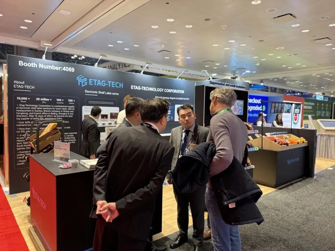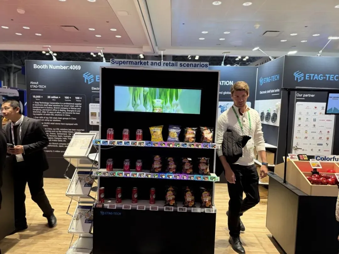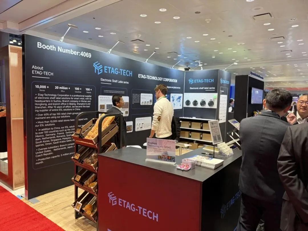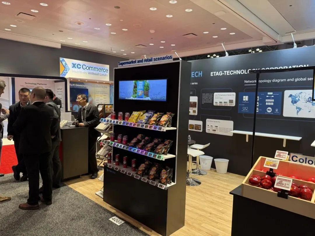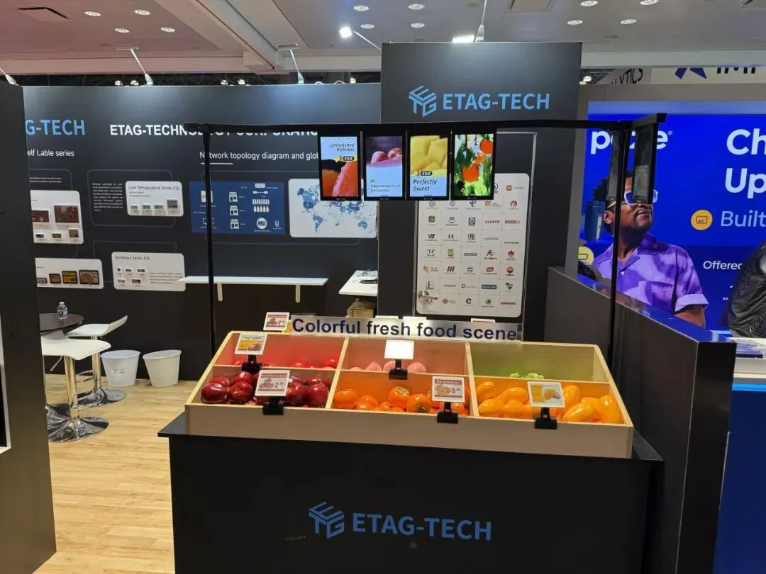 逸岚国际为 ETAG-TECH 打造的展台,把 “产品落地场景” 直接搬进了展区:以深黑 + 科技蓝为主调,用真实货架、生鲜陈列还原超市场景,让电子价签产品 “长” 在实际零售环境里,替代了生硬的展板说明;同时把品牌实力(全球布局、合作案例)嵌在背景墙信息区,兼顾展示与洽谈的功能分区。