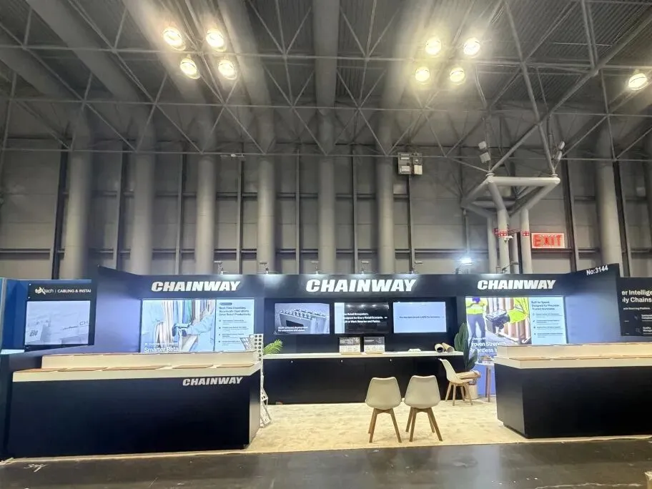 ·视觉与布局:以品牌深黑为主调,顶部重复标识强化记忆点;长桌展示区预留充足空间陈列设备,背景大屏分模块呈现零售、物流等场景的技术落地效果,替代冗余的文字说明;