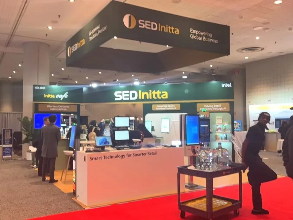 本次展会上,逸岚国际为 SED Initta 打造的展台,以 “墨绿色 + 场景化体验” 凸显其零售科技解决方案的定位