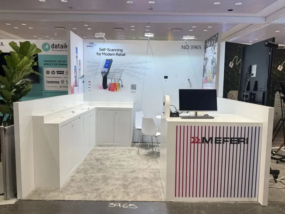 逸岚国际为MEFERI打造的展台,以 “极简白 + 场景化体验” 适配其零售自助扫描方案服务商的定位: