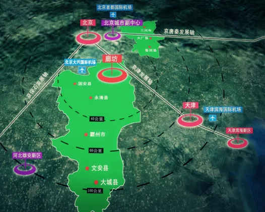 廊坊作为京津资源转移的首选地、区域城市分工的核心区,在京津冀协同发展战略框架下,历史机遇叠加覆盖廊坊全域。北部三县与北京城市副中心隔河相望,主城区和中部两县与北京新机场临空经济区紧密相连,南部三县与雄安新区田水相依,使廊坊尽享四大国策机遇,发展势能空前强劲,加速崛起势不可挡。