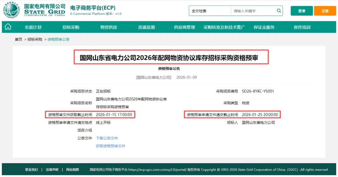 国网山东省电力公司2026年配网物资协议库存招标采购的相关品类采用资格预审方式进行,本次预审结果有效期为预审结果发布之日起至2026年12月31日。在此期间,国网山东省电力公司2026年配网物资协议库存招标采购相应物资类别仅接受资格预审合格的申请人参加投标。在此,特邀请有意愿的潜在申请人(以下简称申请人)提出资格预审申请。