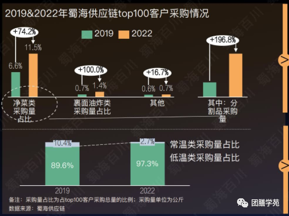 从蜀海供应top100客户采购情况看,据不完全统计,近三年各类半成品采购量大增,包括各类冲调品(如糖浆)裹面油炸类产品以及各类净菜,增幅在20-100%不等。尤其是肉类、蔬菜等净菜。