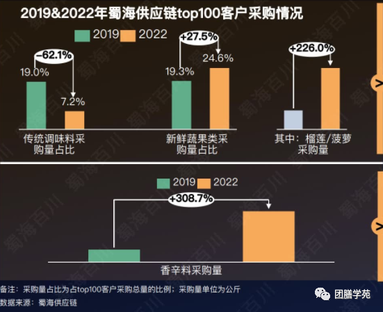 传统调味料中,包括鲜味汁、黄酱、豆豉豆瓣酱、海鲜酱在内的各种调味产品单独采购的比例大幅缩小,而各类素食蔬菜、新鲜水果采购量大涨。其中,高端水果上涨幅度尤为明显,如榴莲、菠萝采购量遽增226.0%。