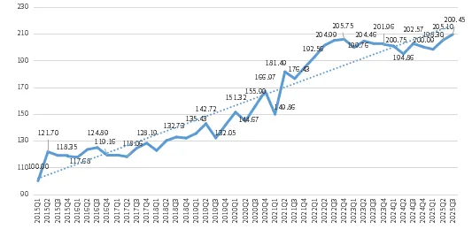 第一个数据是可得性:普惠金融-小微服务可得指数达到了203.47点,比上季度涨了3.02%,意思是每10家有融资需求的企业,就有7家能拿到钱。这比2023年的50%左右,已经提升了不少。