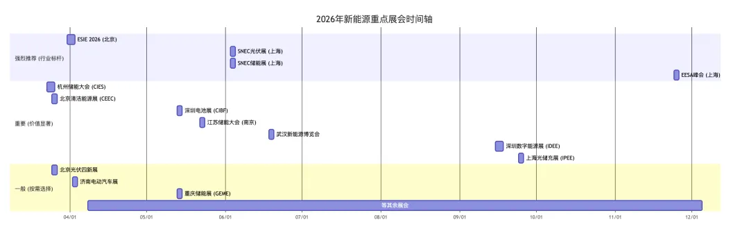 2026年的新能源战场将如何布局?答案或许就藏在全年的展会排期里。我们为您梳理了全年近30场重要展会,并按照时间顺序和重要程度进行了分类梳理,助您一目了然,精准规划。