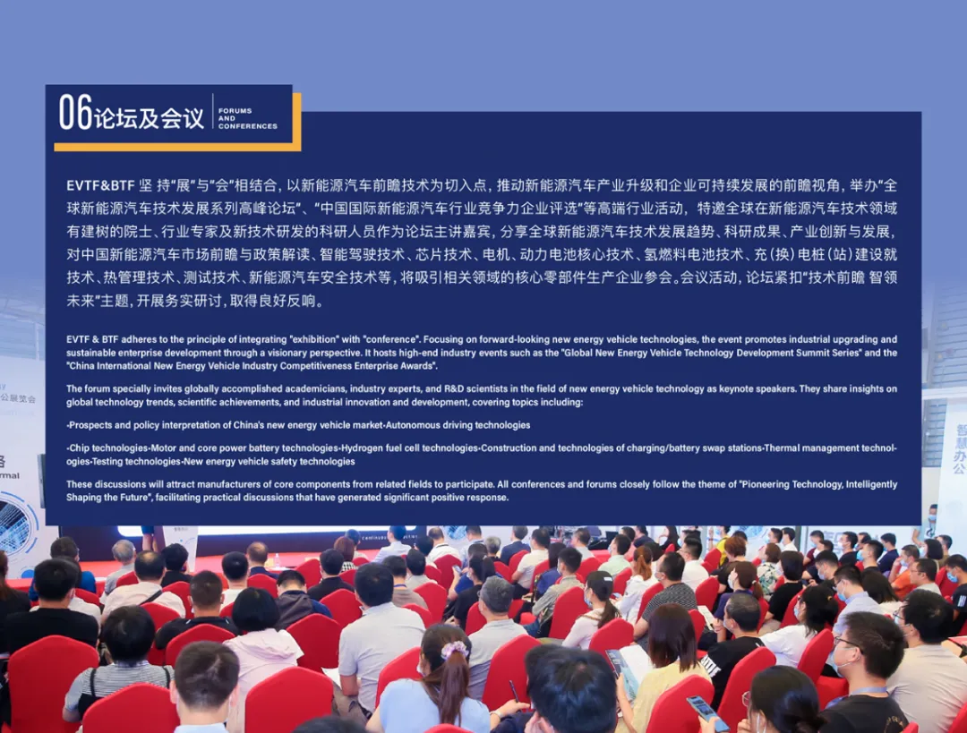 除了丰富的展览内容,同期还将举办100+专业论坛与研讨活动,邀请全球新能源汽车领域的院士、专家及科研人员分享行业发展趋势、科研成果与创新技术。如此来看,这或许是一次深入了解行业动态的绝佳机会。 拓展商业合作新机遇