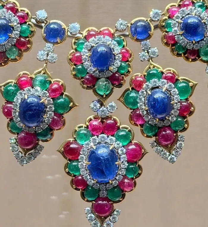 另一边摆着条老古董,1967年的款式,用了蓝宝石红宝石祖母绿还配了钻石。说真的我一开始还担心年代久远会不会土气,结果看到实物发现自己多虑了。