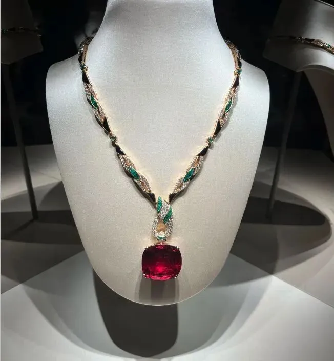 今年蛇年特展上那条红碧玺项链也值得说说。主石就是颗巨大的红碧玺,旁边还搭了祖母绿和钻石做点缀,整个冠状造型特别抓眼球。
