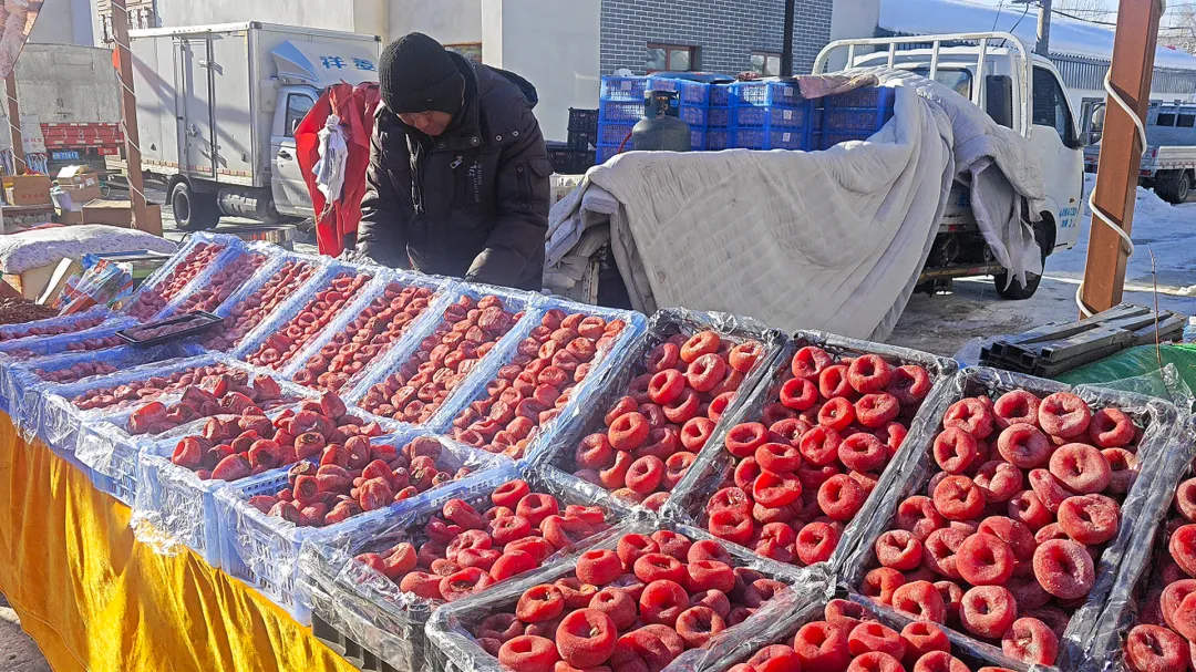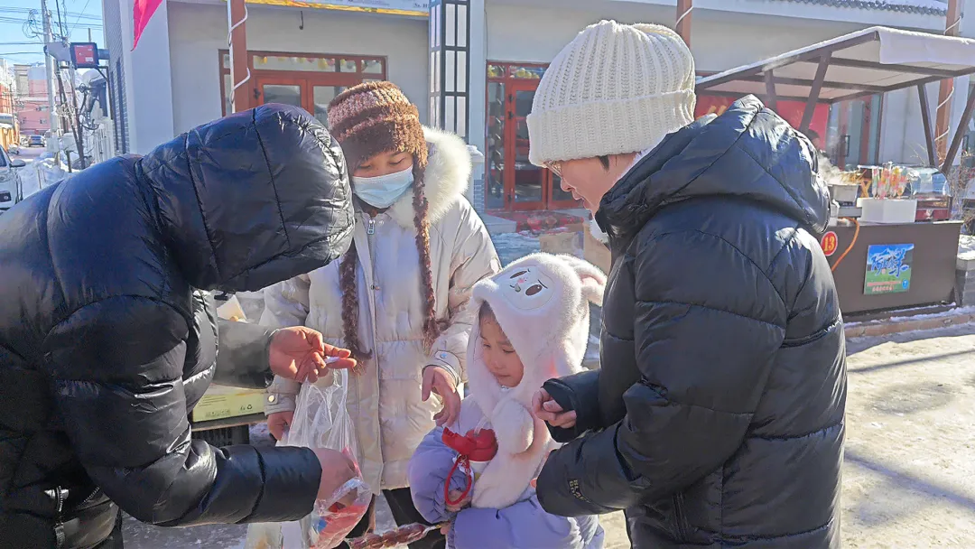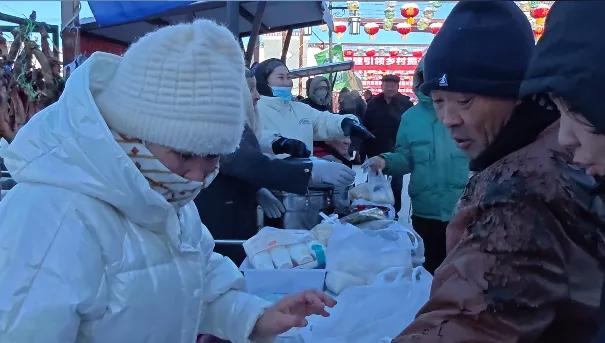 本次展销会的产品品类实现大幅拓展,形成了“特色农牧产品+多元便民商品+休闲零食”的丰富供给体系。在展销现场,既有以阿勒泰羊风干肉为核心的特色农牧产品,还涵盖了海鲜冻品、鲜鱼、糖果、干果、百货商品等便民好物;同时,棉花糖、爆米花、关东煮、糖葫芦、烤红薯等各类特色小吃零食悉数亮相,满足了多方位的消费需求。丰富的商品、浓厚的氛围让展销会成为乡村消费热点。街道上,买家穿梭往来,精心挑选心仪商品;商户热情叫卖、细致地进行介绍;有的商户还做起了现场直播,现场“烟火气”非常浓厚。