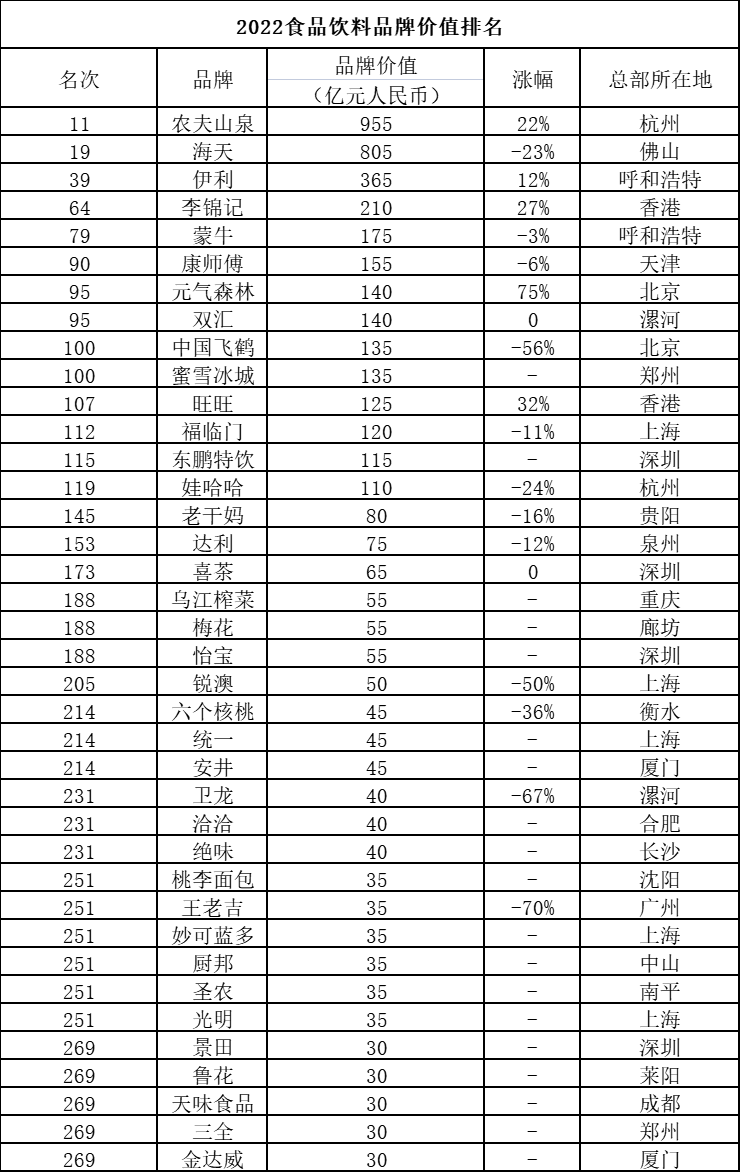 具体到食品饮料行业,农夫山泉取代海天成为最具价值食品饮料品牌,品牌价值比去年上涨22%至955亿元。海天下降一位至第二,品牌价值下降23%至805亿元。伊利保持第三,品牌价值上升12%至365亿元。38个食品饮料品牌价值占全榜单7%。