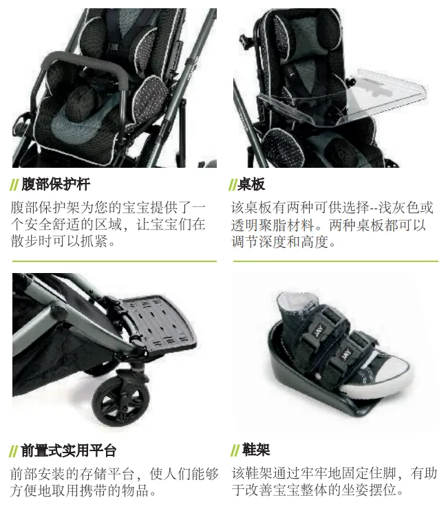 头部支撑,骨盆带,胸带,分腿器,脚踏板,倾斜角度,靠背高度,躯干侧向支撑高度宽度,髋关节支撑高度宽度均可调节,为宝宝提供最贴心的保护。