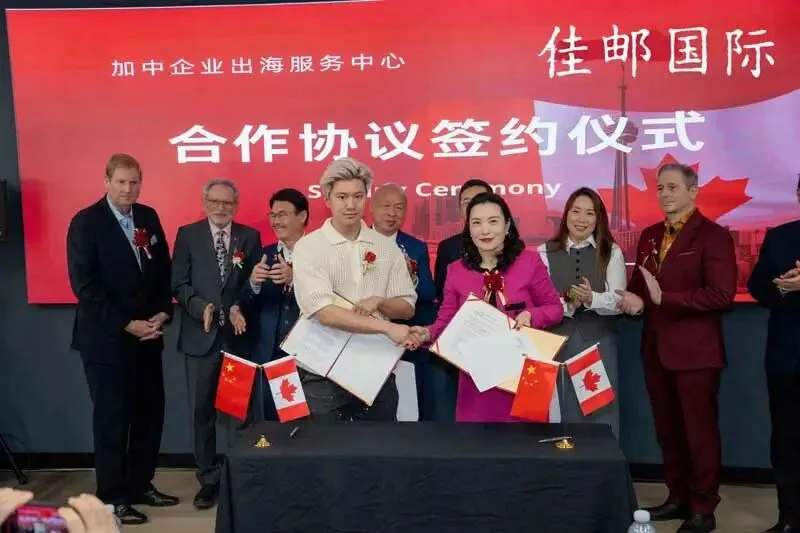 在当天的新闻发布会上,主办方还举行了五项合作项目签约仪式,分别包括:出海中心与加拿大大西北商会合作签约、出海中心与佳邮国际合作签约、出海中心与加中校友商业联盟合作签约、采购商Gmsy Canada Ltd.与乐享食品合作签约,以及出海中心与加拿大共工新闻社合作签约。