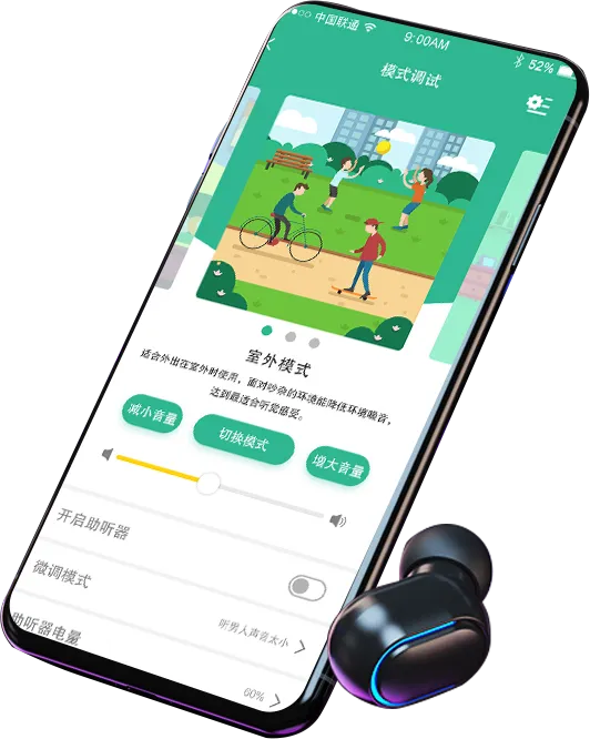 ●展品简介:免验配/自验配的智能助听器,用户根据手机APP测听听力图输入智能精准验配,同步支持医院和验配店测试的听力图。产品有三种场景,可根据实际情况切换使用——正常(通用)模式、户外(吵杂)模式、室内(安静)模式、APP循环切换,此外还有大图标按键,解决老年用户手指不灵活机体小按键切换不方便。