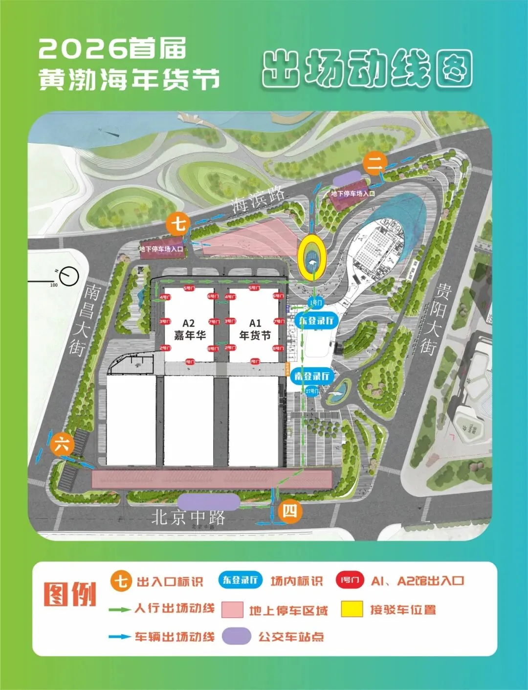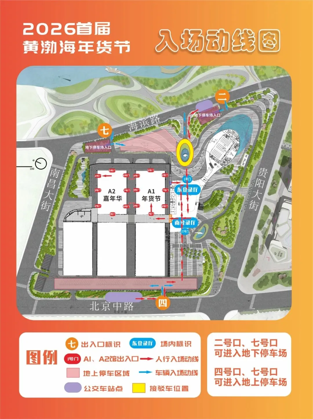 A2馆4号门--东广场停车区域--七号出入口--海滨路。