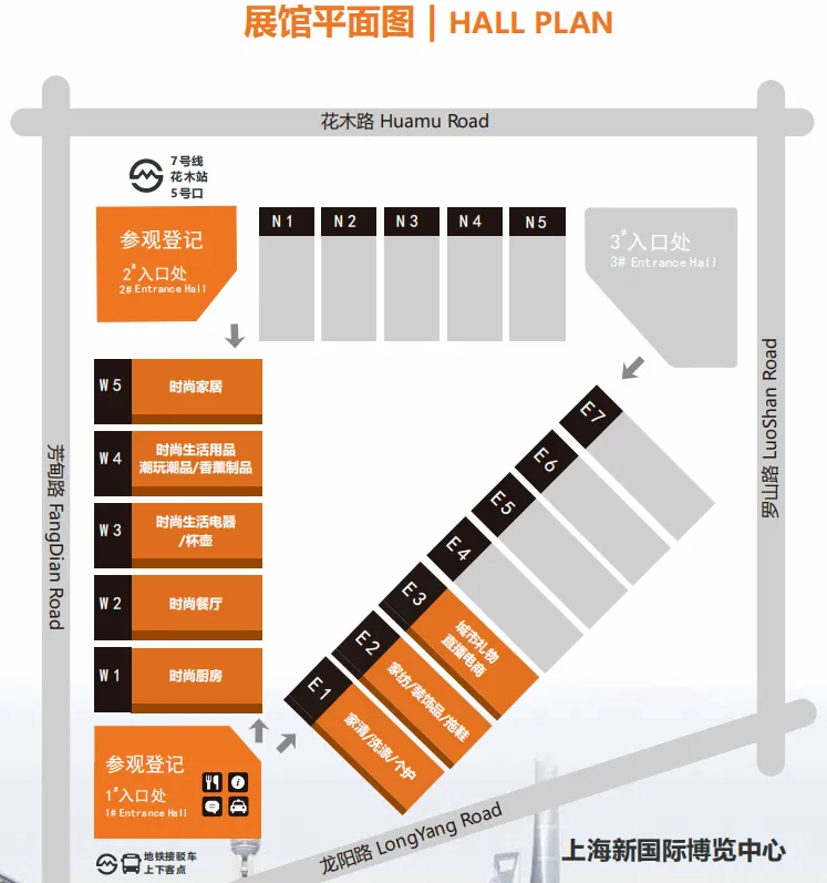 公交线路581、746、798、975、976、989、1023、大桥六线、龙东专线、龙芦专线、龙港快线、龙临专线、龙大专线、龙惠专线,到“龙阳路地铁站”下车,换乘地铁7号线“花木路站”下车,步行100米至博览中心,或在“龙阳路地铁站”乘免费班车至博览中心;