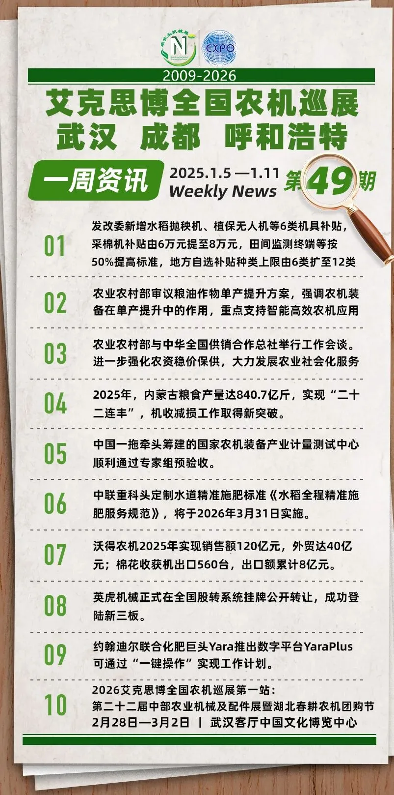 2. 农业农村部审议粮油作物单产提升方案,强调农机装备在单产提升中的作用,重点支持智能高效农机应用。