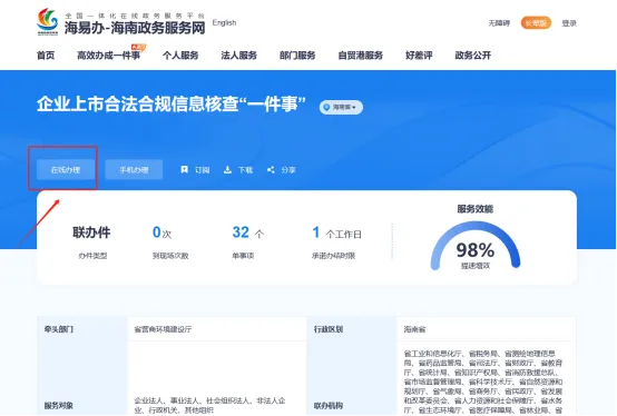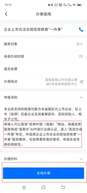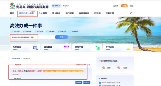 为推动政府职能的深刻转变和“放管服”改革的加速实施,海南省营商环境建设厅紧密结合企业和群众的实际办事需求,通过细致梳理和有效整合涉及多部门、多事项的业务流程,不断推出系列“高效办成一件事”主题服务,涵盖了新生儿出生、入园入学、就业、就医、婚育、扶残助困、民生保障、退休、水电气网以及退役军人转籍等重要方面。这些服务的推出,极大地简化了申报流程,申请人仅需提交一次申请、填写一份表单、准备一套材料,即可一次性办理多个事项的集成化服务,有效促进了企业和群众“高效办成一件事”的便利化体验。今天我们来了解“企业上市合法合规信息核查一件事”申报办理操作流程。