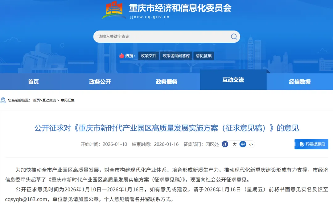 近日,据重庆市经济和信息化委员会,公开征求对《重庆市新时代产业园区高质量发展实施方案(征求意见稿)》的意见,其中提到: