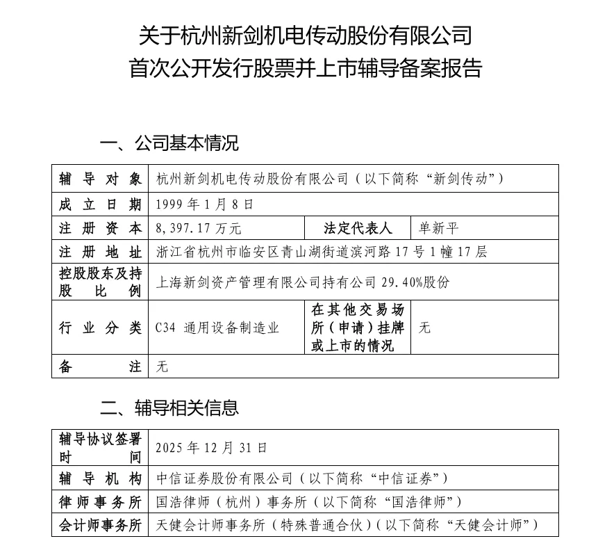 与此同时,新剑传动的资本化道路也同步开启。2026年1月9日,公司正式启动上市辅导,由头部券商中信证券担任辅导机构。根据流程,辅导人员将在2026年4月至5月对公司进行综合评估,并协助准备IPO申请文件。