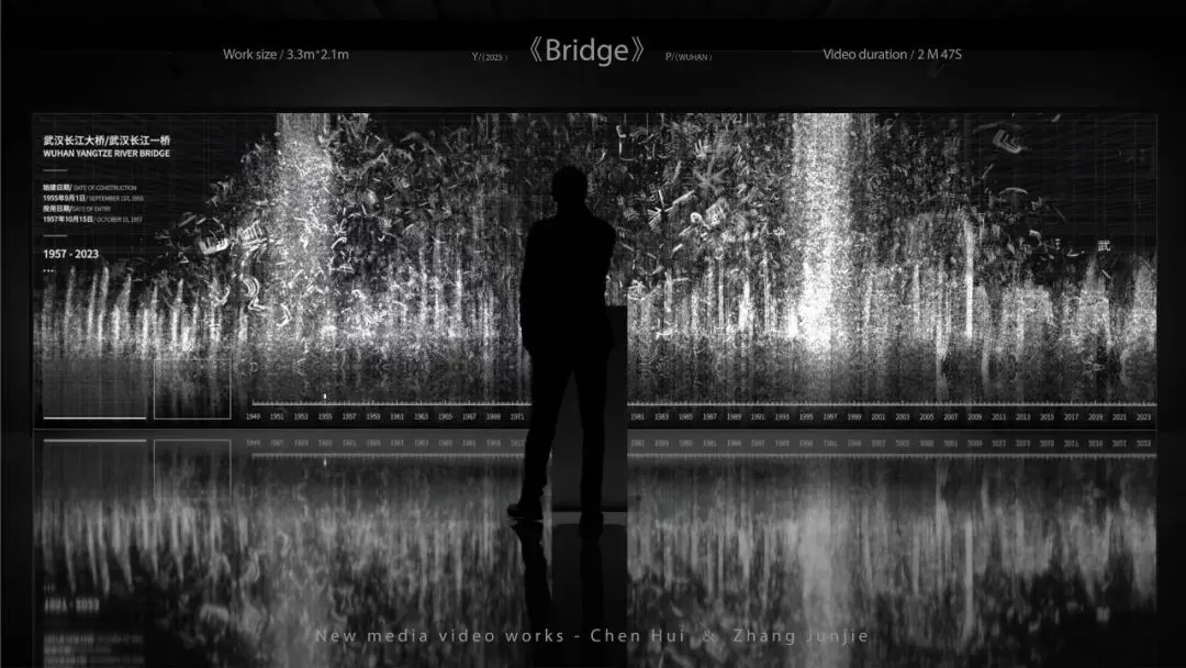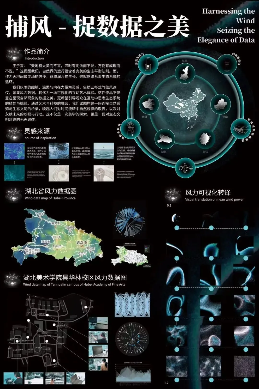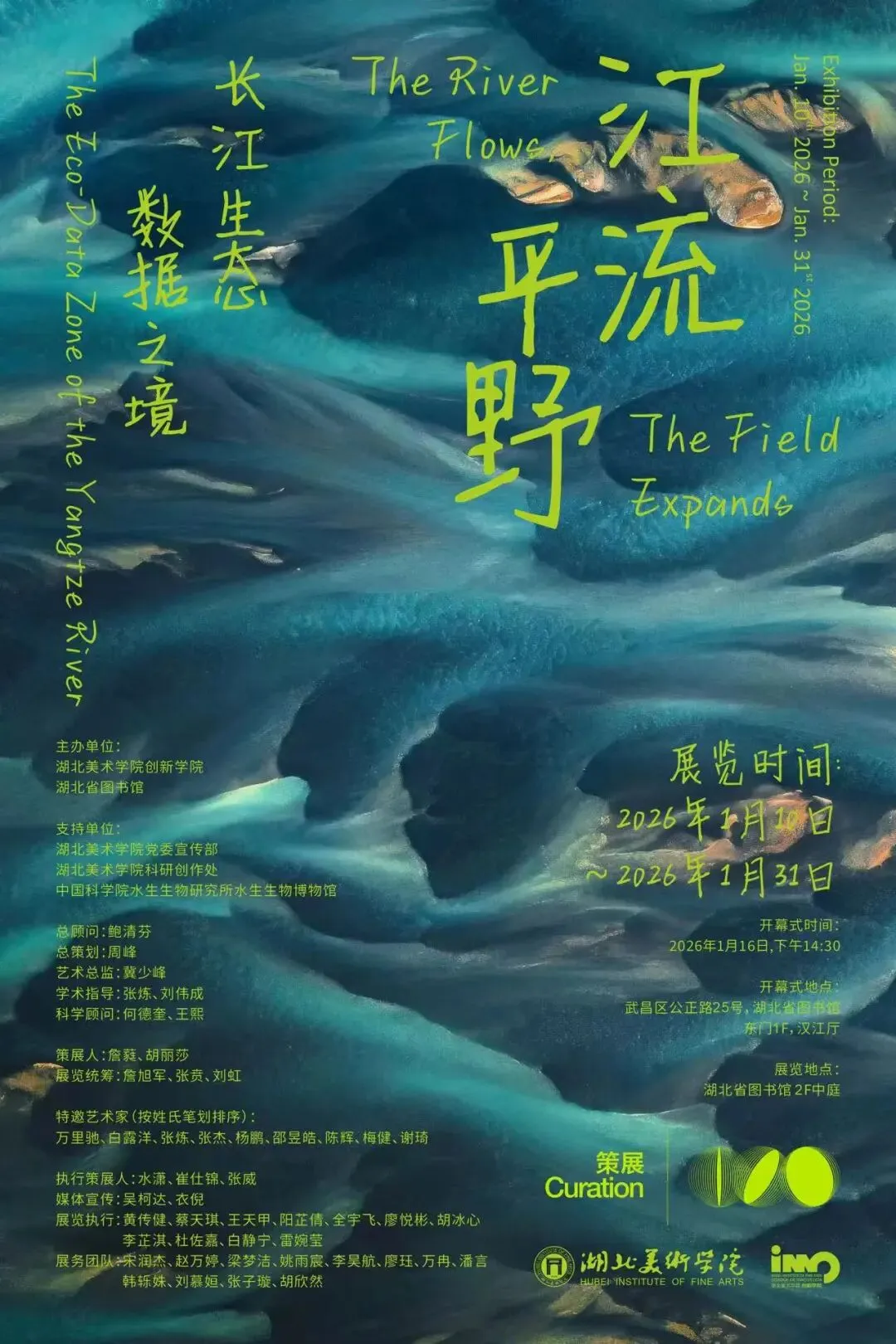 本次展览,正是立于这历史与未来的交汇点。我们以数据为舟,从长江生态的“数据湍流”中舀取一瓢精华,通过采集、检测、分析、创作与演绎,构筑起一座跨越自然与数字的“长江生态数据之境”。在这里,数字技术与视听语言碰撞出创意火花:我们以“数据可视化”为笔,将抽象科研数据,转化为可感可知的视觉诗篇,让自然系统的内在逻辑化作流动的光影;以“艺术与科技”为器,在数据的基底上创作和演绎,描绘长江流域生态系统的平衡关系,转译江汉平原的自然肌理;以“学院美育”为镜,映照新时代青年学子在数据流动中捕捉自然韵律,在跨学科实践中搭建科学与艺术的桥梁,以实际行动参与“美丽湖北”的建设。