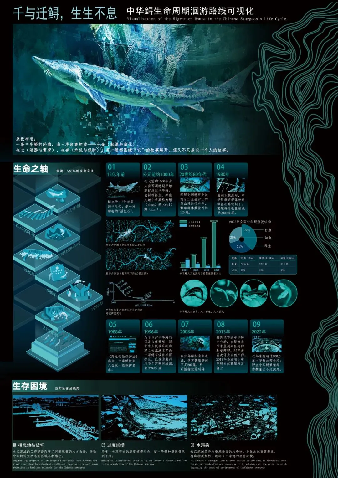 “创新之境”展现艺科融合的师生共创。一方面遴选创新学院2024级本科生在《艺术实践与考察》课程的多件艺术设计作品,通过数字艺术、交互装置、沉浸式叙事、艺术与科技等媒介,探索长江水生物的生态美学在数字语境下的艺术表达。另一方面,聚焦学院“艺心科普”社会实践项目的作品,生动展现青年学子运用专业所长激活长江生态价值、助力生态产品价值实现的创作实践。此外,特邀艺术家作品9件,体现艺术设计教育在生态文明建设中的社会责任与文化引领,构建“展、教、研、创、用”一体化的社会美育现场。