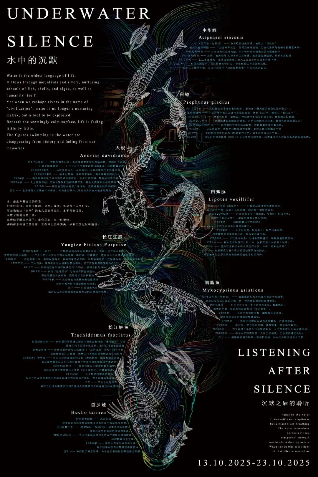 “生态之境”聚焦生态监测数据的艺术重构。依托中国科学院水生生物研究所水生生物博物馆提供的监测数据、物种信息、环境指标等数据,将“长江十年禁渔”的阶段性成果、水生生物完整性指数的变化、以及“江湖安澜、碧水东流”的治理成就,通过数据可视化的艺术形式,转化为可感知、可共情的视觉语言。呈现的几件作品,引导人们关注长江流域的生物多样性与生态现状,探讨人类如何借助数字技术体悟生态系统的内在逻辑,在艺术与科技层面建立人与自然的新型联结。