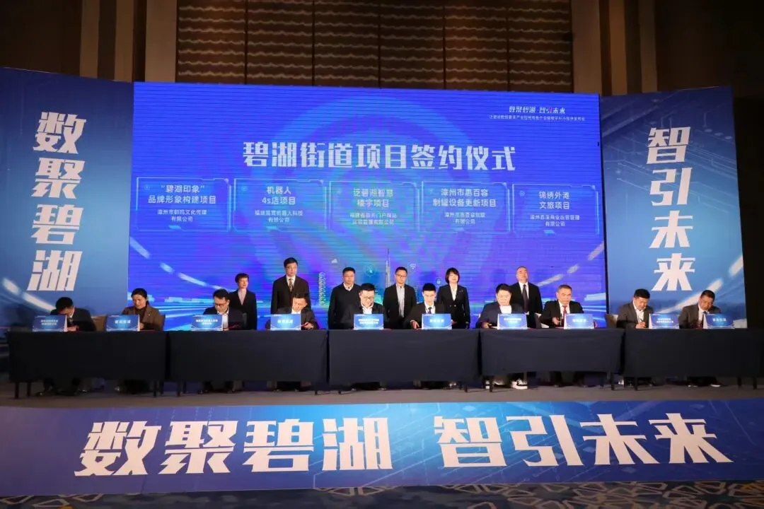 活动中,泛碧湖数据要素产业园正式揭牌。现场聘任9位招商大使,并与漳州市鹤鸣文化传媒有限公司、福建晟育机器人科技有限公司、福建省政务门户网站运营管理有限公司、漳州市惠百容制罐有限公司、漳州西溪商业运营管理有限公司等5家企业完成签约,合作范围涵盖智慧楼宇、设备更新、机器人4S店、文化旅游、品牌形象构建等多个重点领域,为产业园发展注入实质动力。
