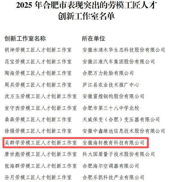 近日,合肥市总工会公布了2025年表现突出工作室名单,大圩镇商会会长单位安徽海轩教育科技有限公司旗下的吴群学劳模工匠人才创新工作室成功入选,获评市级“表现突出工作室”。2025年,工作室在核心成果“海轩云智屏”基础上,全新研发“AI分析平台系统”“海轩测培屏”,均斩获国家计算机软件著作权;创新成果不仅荣获2025年“王选新闻科学技术奖”二等奖,更亮相世界制造业大会、长三角文博会等高端展会,作为安徽省数字化标杆案例推动跨区域资源共享,经济社会效益显著。
