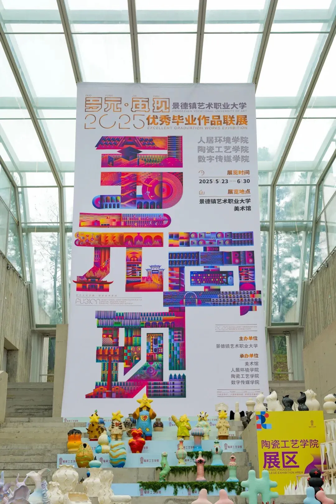 陶瓷艺术设计、产品设计、雕塑等264件参展。展览如一场古今中外艺术对话,呈现陶瓷的灵动、产品的实用、雕塑的雄浑。釉色的高温蜕变、器型的大胆突破,既传承匠心温度,又展现青春创意。当窑火与创意交相辉映,每一件作品皆凝聚智慧与热忱,生动演绎传统与现代的完美融合,彰显青春与时代的和谐共鸣。