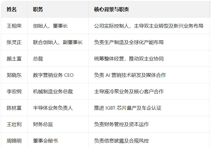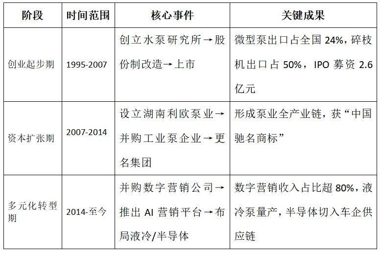 成立背景:1995年由王相荣创立温岭市新科水泵研究所,2007年4月27日在深交所中小板上市,是中国泵行业首家上市公司。业务定位:从单一泵业制造转型为“机械制造+数字营销”双主业,叠加液冷泵与半导体IGBT新兴业务的科技型企业。核心标识:泵业领域民用泵出口连续十余年全国第一,数字营销为头部媒体核心代理,液冷泵是华为核心供应商(份额70%-80%)且获英伟达认证,半导体业务切入头部车企供应链。二、发展历程三阶段