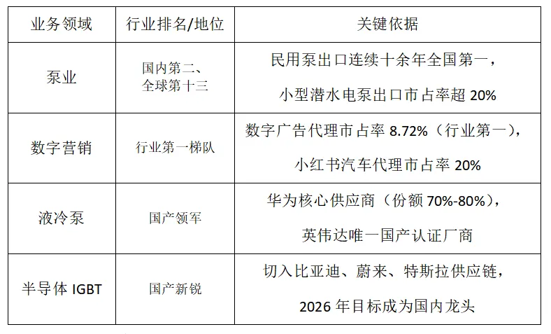 液冷泵:年产能120万台,中标银川“东数西算”项目1.2亿元,预接北美订单0.8亿元,潜在订单超5亿元半导体IGBT:控股狮门半导体(53.33%),温岭基地一期产能325万颗/年,2025年目标营收5亿元,2026年产能扩至4亿颗四、行业地位核心表现