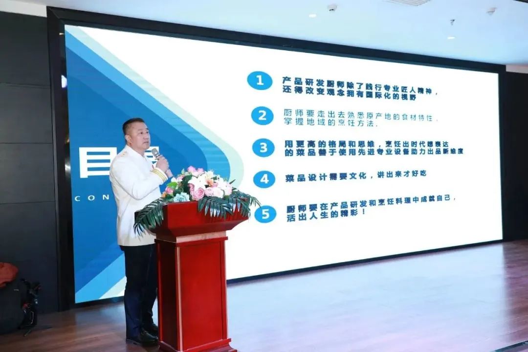 会议上陈成江大师分享菜品研发经验。他认为产品研发厨师除了践行专业匠人精神,还得改变观念拥有国际化视野;厨师要走出不去熟悉原产地的食材特性,掌握地域的烹饪方法;用更高的格局和思维,烹饪出时代想表达的菜品,善于使用先进专业设备助力出品新维度;菜品设计需要文化,讲出来才好吃;厨师要在产品研发和烹饪料理中成就自己,活出人生的精彩。