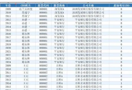 年份、CEO姓名、股票代码、股票简称、公司名称、超级明星CEO