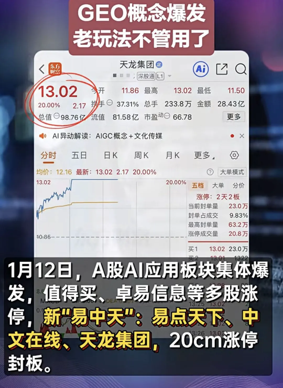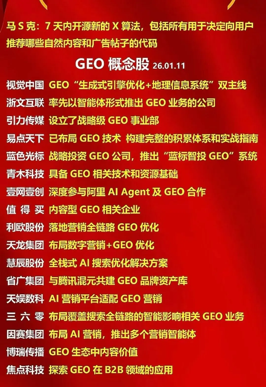 这一决策迅速引发连锁反应。在太平洋彼岸的A股市场,GEO板块逆市走强,多家相关企业在短时间内实现市值的大幅跃升。