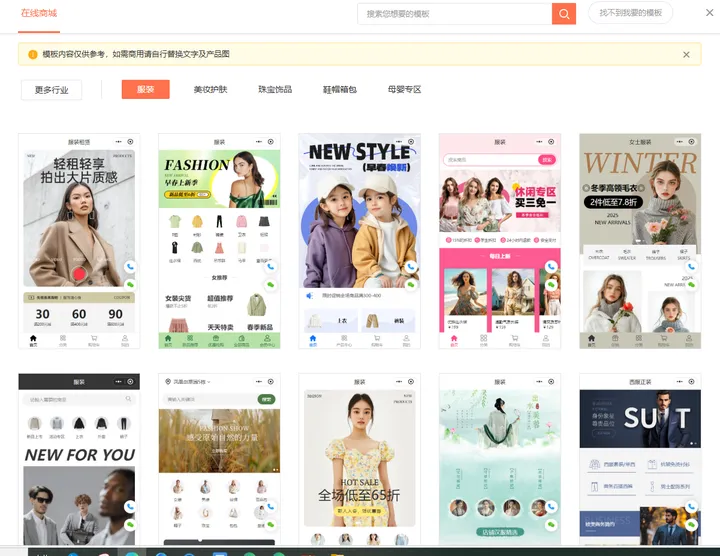 首先,我们打开官网,然后注册一个账号。注册完账号之后呢,我们进入模板中心,筛选“服装”这个行业,然后选择一款符合自己门店风格的模板。
