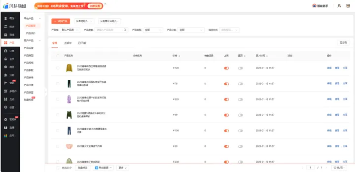 装修完小程序之后,我们进入管理后台。我们点击“产品”-“产品管理”标签页。在这里,我们可以手动上架产品,也可以通过本地或者电商平台批量导入。上架完商品之后,我们也可以对商品进行精细化分类管理。与此同时,在这里我们也可以查看到各个商品的销售记录和录入时间等等,也可以进行置顶、下架、分享等操作。