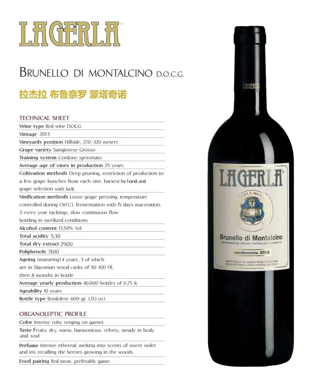 布鲁奈罗果味奔放,酸度高,单宁厚重,极具陈年潜力。年轻的布鲁奈罗蕴含水果和鲜花的香气,酸度较高,单宁诱人,入口时有收敛之感,因此经过瓶陈的布鲁奈罗风味更佳,是值得等待的好酒。