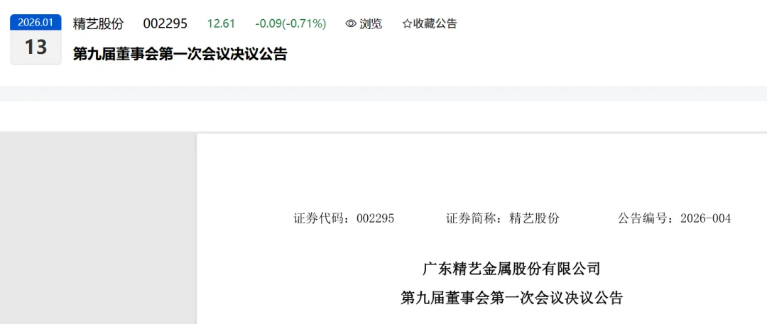 广东精艺金属股份有限公司(以下简称“公司”)第九届董事会第一次会议于2026年1月12日(星期一)在公司会议室以现场结合线上会议的方式召开。经全体董事一致同意,本次会议豁免通知时限要求,会议通知于公司2026年第一次临时股东大会选举产生第九届董事会后,以现场及电话通知送达全体董事。