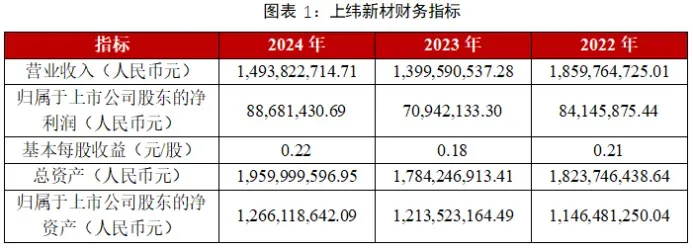 上纬新材料科技股份有限公司(股票代码:688585)成立于1992年,2020年在科创板上市,主营环保高性能耐腐蚀材料、风电叶片用材料、新型复合材料的研发、生产和销售。公司产品属于新材料领域,下游主要应用领域包括节能环保和新能源两大领域。2022年、2023年、2024年,上纬新材的归母净利润分别为8868.14万元、7094.21万元、8868.14万元。