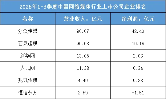 根据东财行业分类,2025年1-3季度中国网络媒体行业上市公司企业排名如下:(A股上市公司)