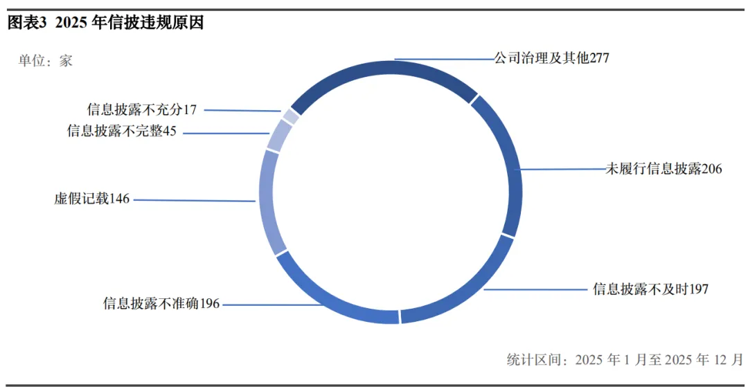 2025年已有637家A股公司因违规受罚,因“公司治理及其他”问题受罚的上市公司数量最多,共有277家;其次因“未履行信息披露”违法违规的上市公司有206家;因“信息披露不及时和不准确”违法违规的上市公司分别有197家、196家。整体来说公司治理及其他、信息披露不及时、不准确是上市公司违法违规问题的重灾区,详细被罚的主要原因涉及信息披露违规(定期报告、互动平台回复、其他平台未披露信息等)、内幕交易、短线交易、违纪,以及其他等问题。