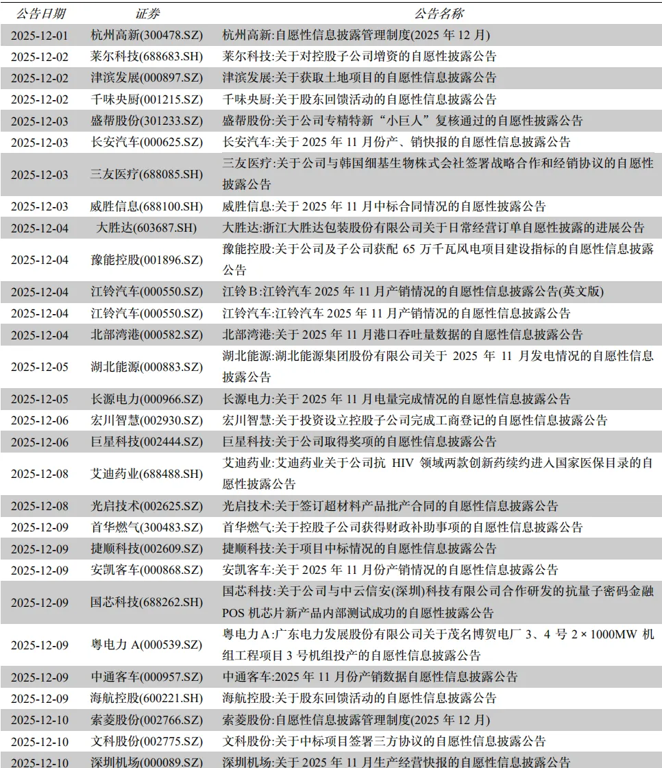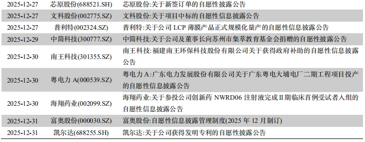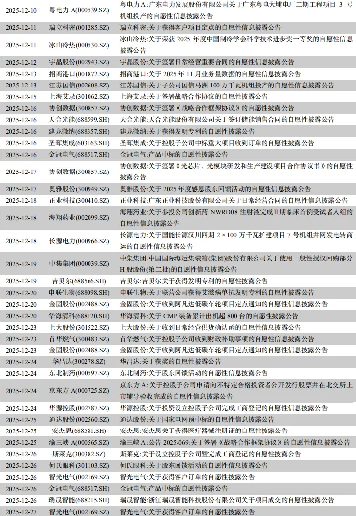 自愿性信息披露是上市公司履行持续信息披露义务的重要内容,也是强制性信息披露必要和有益的补充。2025年全年共有819家公司发布了923份自愿性披露公告,其中2025年12月共有65家公司发布了76份自愿性信息披露公告,涉及内容多样,包括合获得认证、管理办法/制度、获得补贴(资助)、月度经营情况、重大合同、投资设立公司、公司关联方基本资料变更、签订协议、增资扩股、回购进展情况等自愿信披内容,其中有确定自愿性信息披露标准的,也有制定了自愿性信息披露管理制度的,具体情况如下: