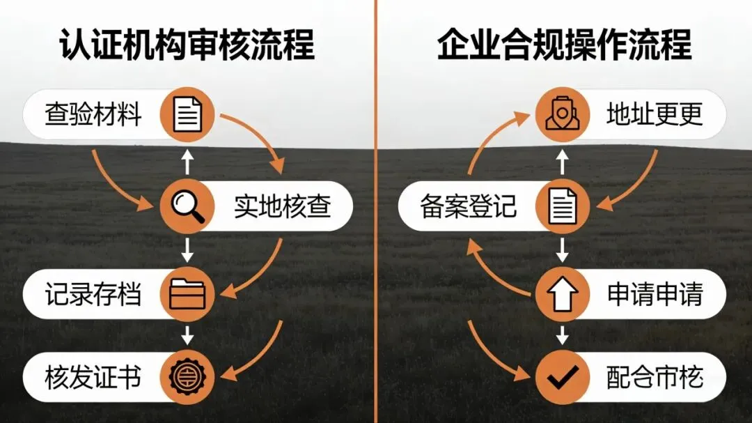 - 企业地址发生变更时,认证机构应重新开展现场审核,确认变更后地址的运营条件符合认证标准,再核发新证书。