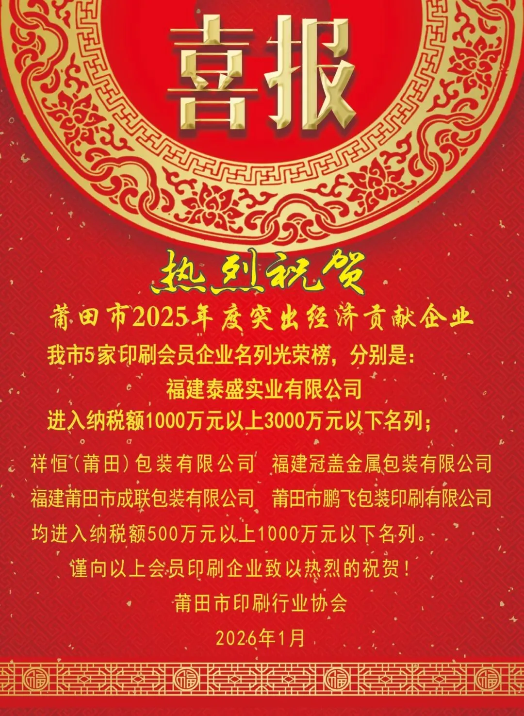 荣登“莆田市2025年度突出经济贡献企业光荣榜”