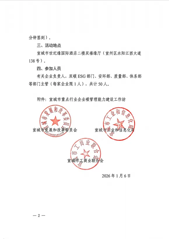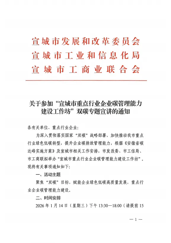 为深入贯彻落实国家“双碳”战略部署,加快推动重点行业绿色低碳转型,提升企业碳排放管理能力,根据相关政策及工作安排,安徽省宣城市发改委、市工信局、市工商联拟举办“宣城市重点行业企业碳管理能力建设工作坊”双碳专题宣讲会。请感兴趣的单位、企业查看通知详情,并扫描文末二维码报名。