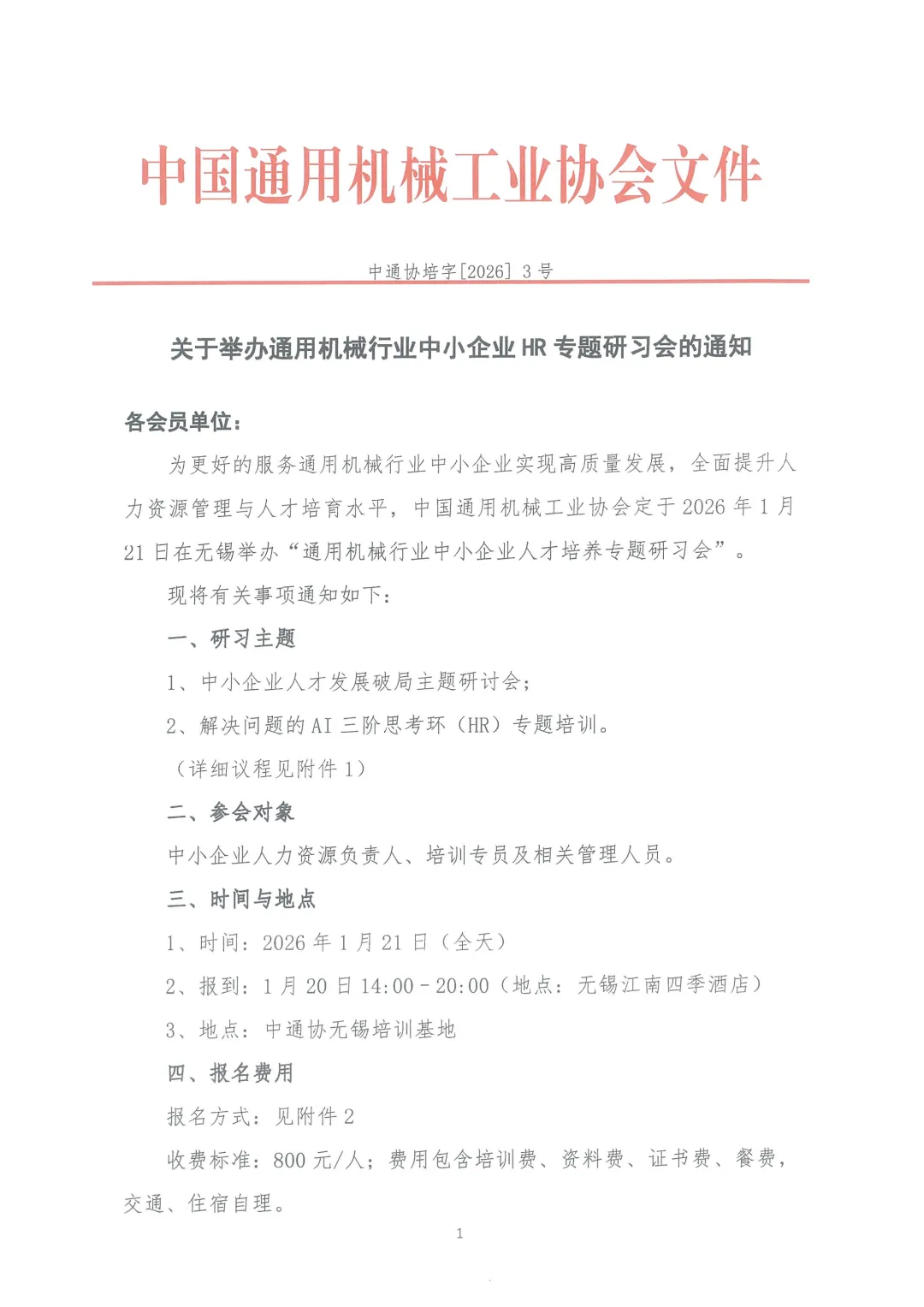 为更好的服务通用机械行业中小企业实现高质量发展,全面提升人力资源管理与人才培育水平,中国通用机械工业协会定于2026年1月21日在无锡举办“通用机械行业中小企业人才培养专题研习会”。