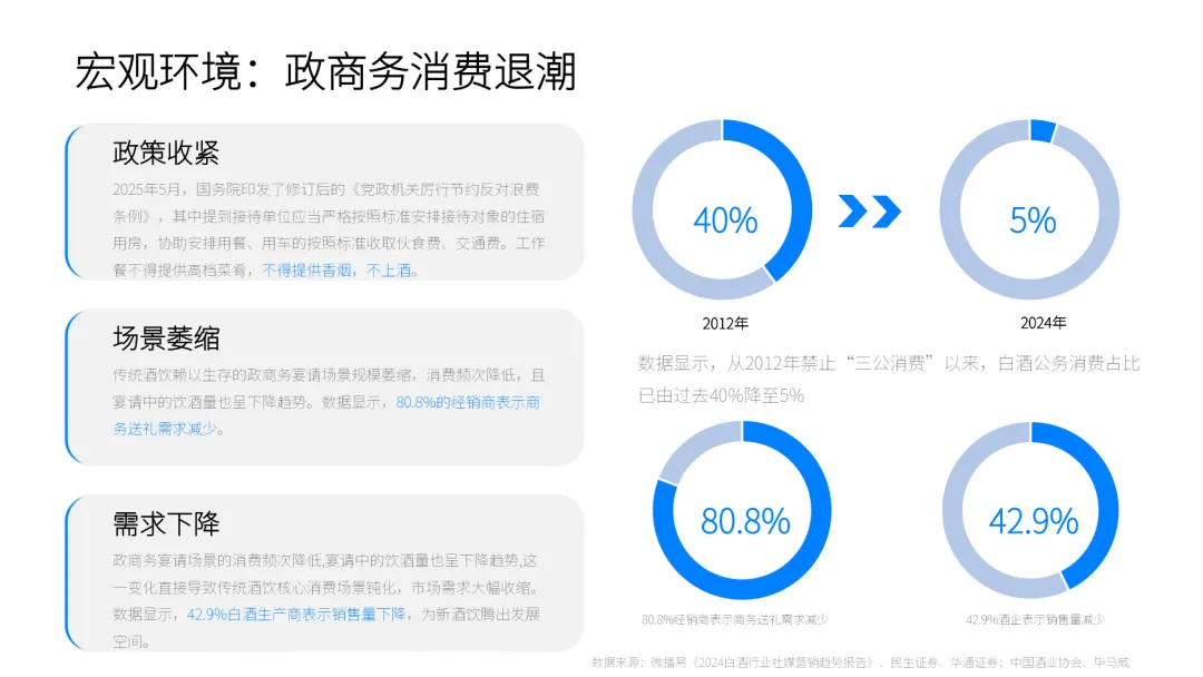 新酒饮行业正迎来结构性增长机遇,传统酒类市场承压与消费需求变革共同推动行业迭代。政商务消费退潮与悦己消费爆发形成鲜明对比,2024 年悦己消费占比达 37%,小聚、独酌等场景成为主流,79% 的新酒饮购买源于社交悦己需求。