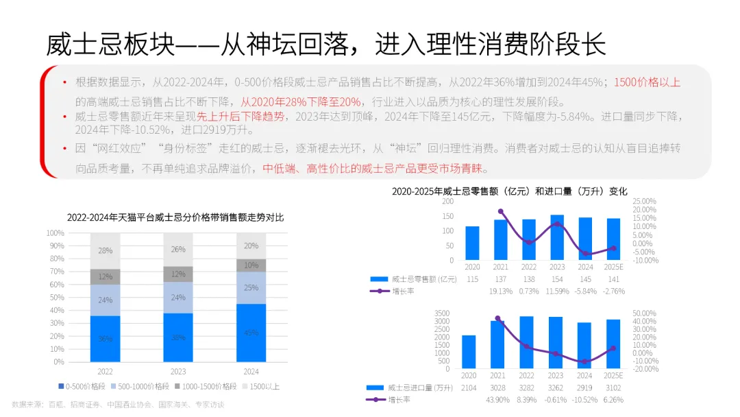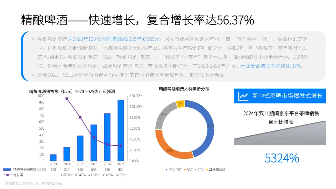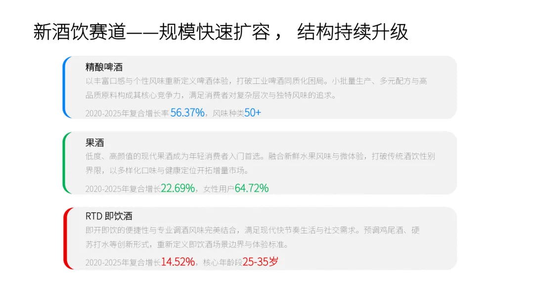 传统酒类全面下滑,白酒产量连续多年萎缩,2025 年 1-10 月同比下降 11.5%,啤酒、葡萄酒、威士忌市场均面临增长乏力。而新酒饮赛道规模快速扩容,精酿啤酒、果酒、RTD 即饮酒成为核心增长点,2020-2025 年复合增长率分别达 56.37%、22.69%、14.52%,2025 年市场规模预计达 1351 亿元。